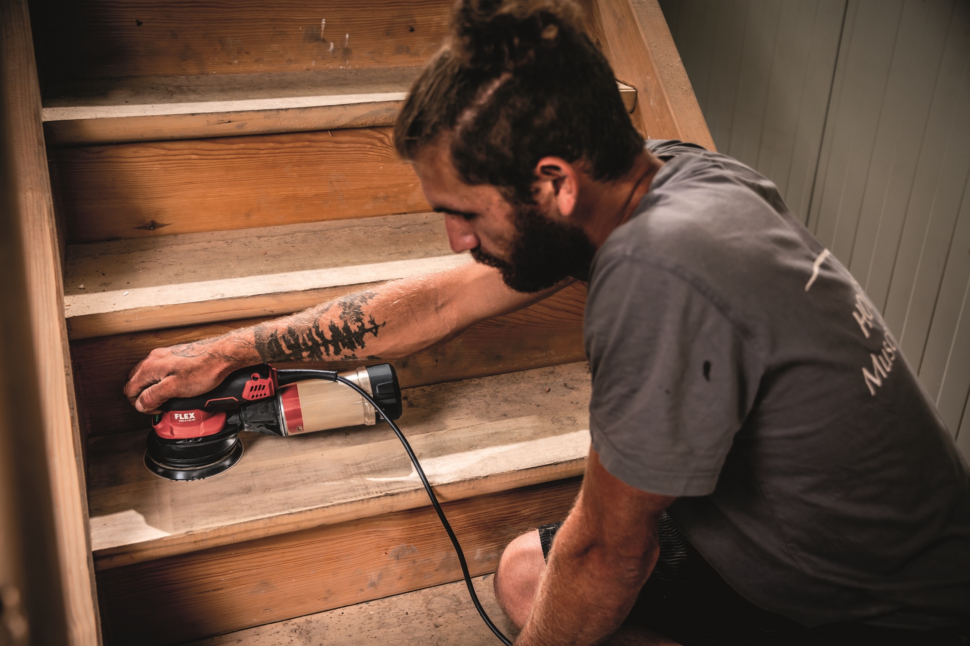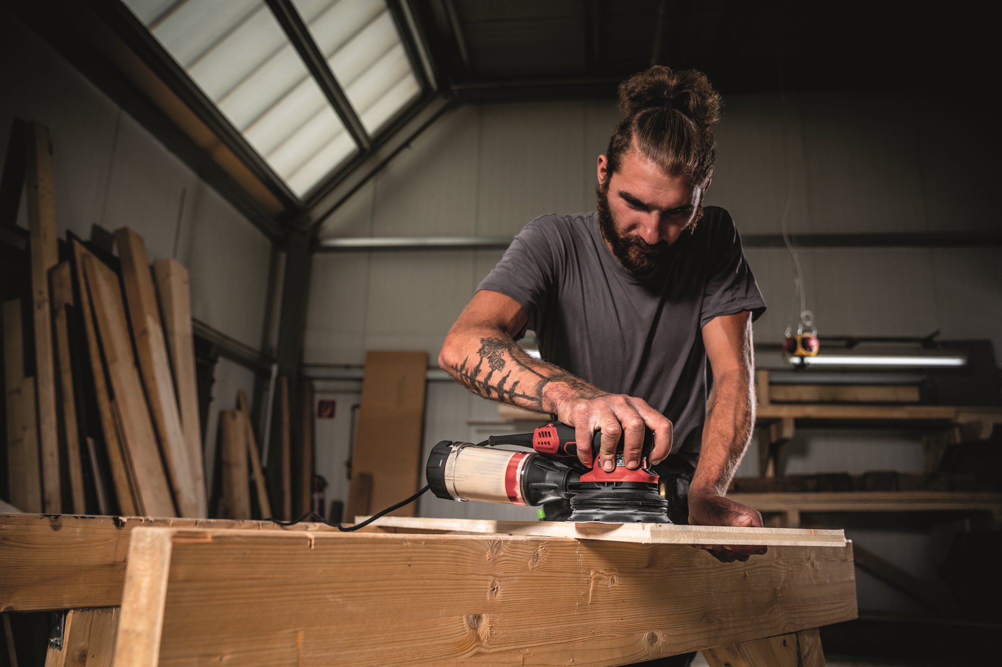 Leichter, kompakter Einhand-Exzenterschleifer, besonders ergonomisch und vibrationsarm durch spezielle Auswuchtung für ermüdungsfreies und gelenkschonendes Arbeiten
