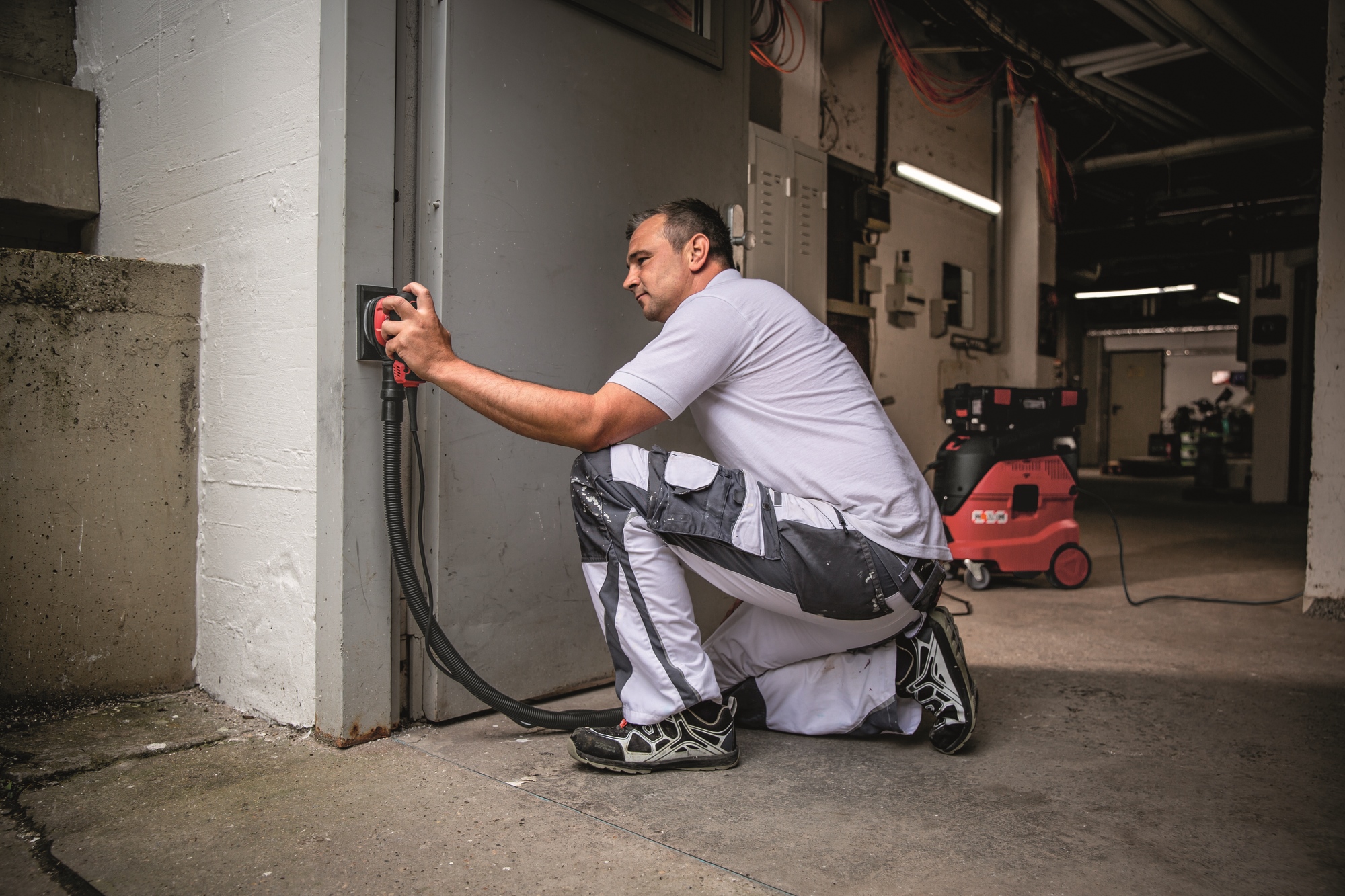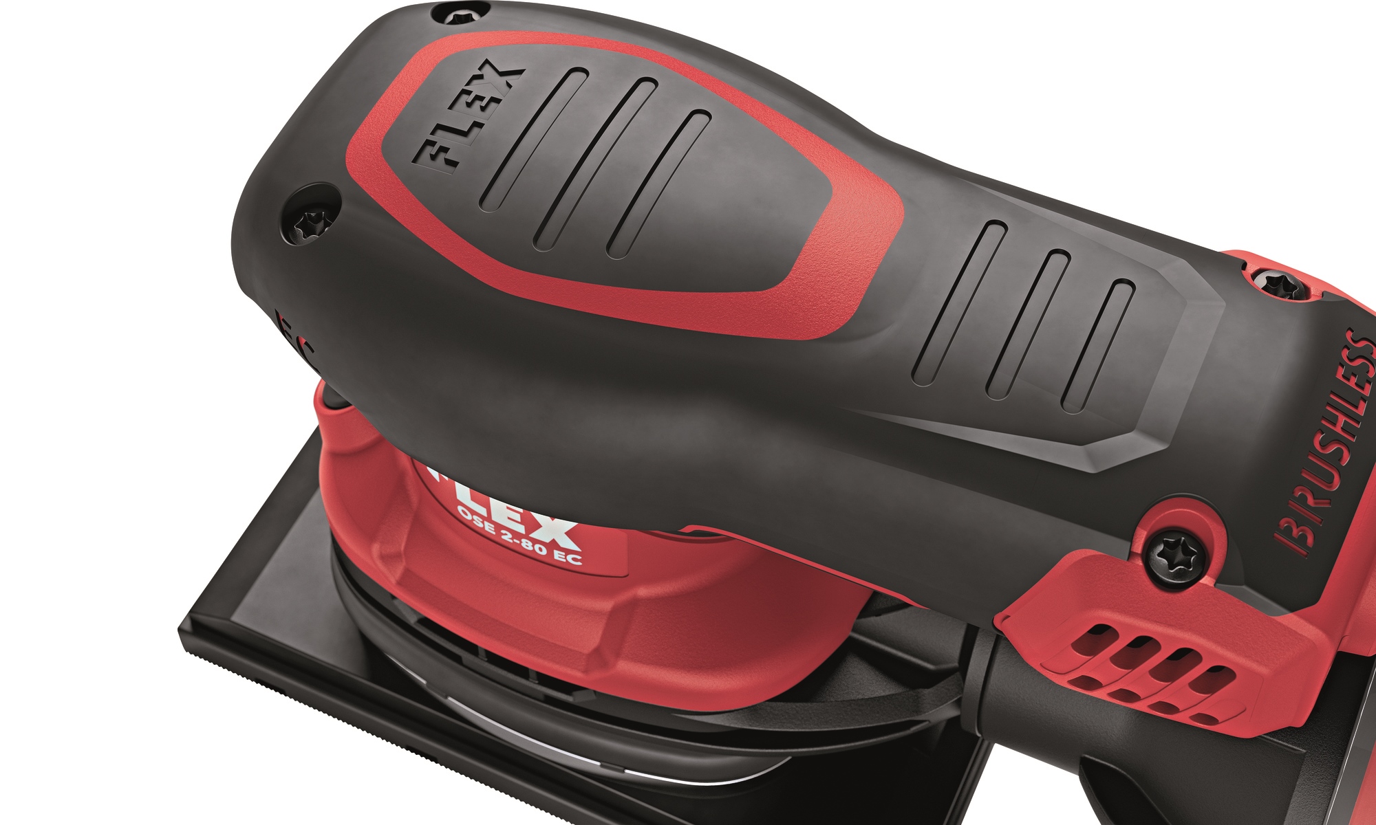 Leichter, kompakter Einhand-Schwingschleifer, besonders ergonomisch und vibrationsarm durch spezielle Auswuchtung für ermüdungsfreies und gelenkschonendes Arbeiten
