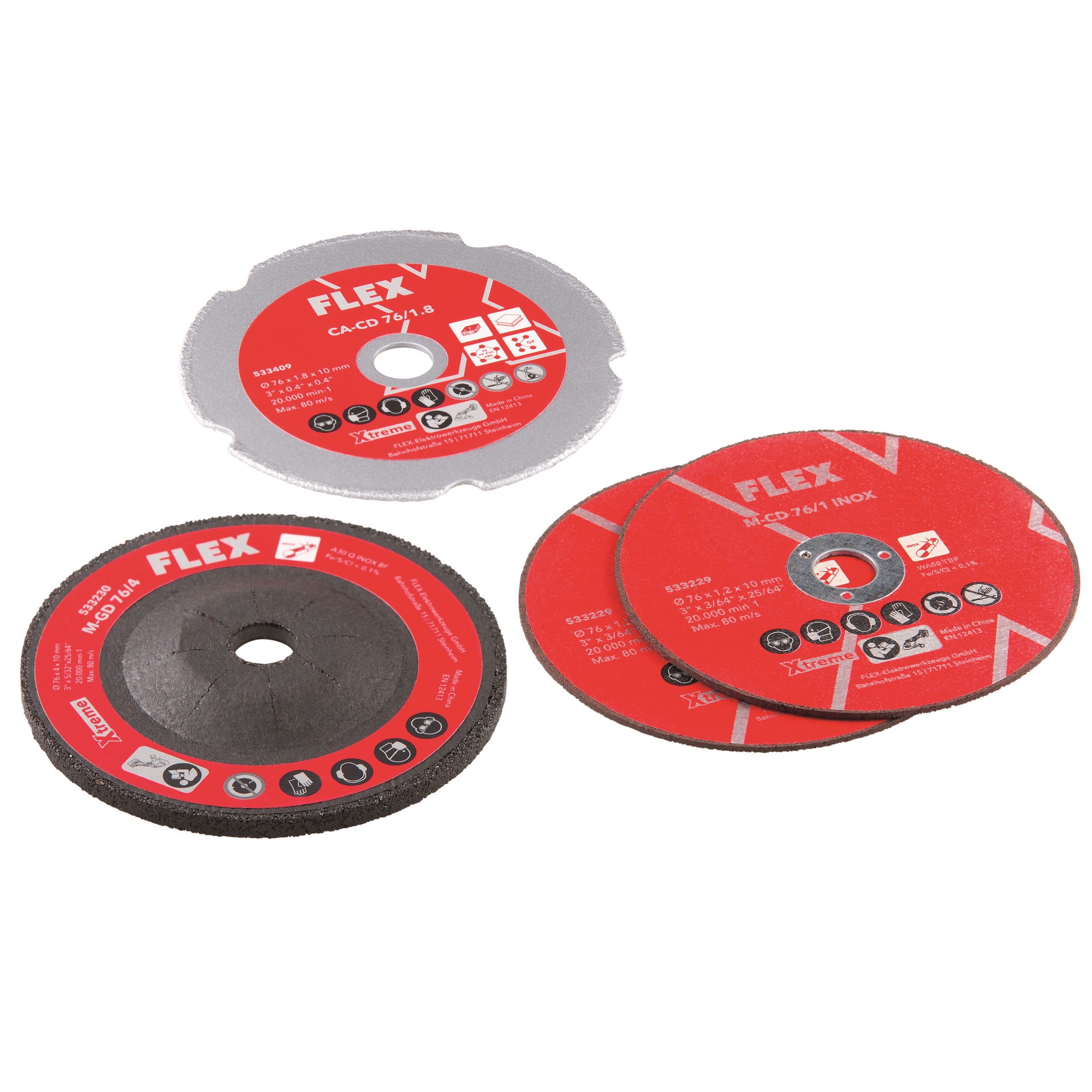 Vierteiliges Zubehörset für den Mini-Winkelschleifer LBE 76 das viele Anwendungen abdeckt. Die dünne Trennscheibe für schnelles Trennen von Rohren, Profilen und Blechen, Stärke 1 mm, eine Universal-Schruppscheibe für die gesamte Metallbearbeitung, Stärke 4 mm. Abgerundet wird das Set durch eine Carbide Trennscheibe mit scharfer und widerstandsfähiger Schneidefläche, Stärke 1,8 mm. Hervorragend zum Schneiden von Materialien wie z.B. Holz mit Nägeln, Kunststoff, GFK und Trockenbauplatten. Alle Scheiben sind frei von eisen- und schwefelhaltigen sowie chlorierten Füllstoffen. Scheibendurchmesser Ø 76 mm.