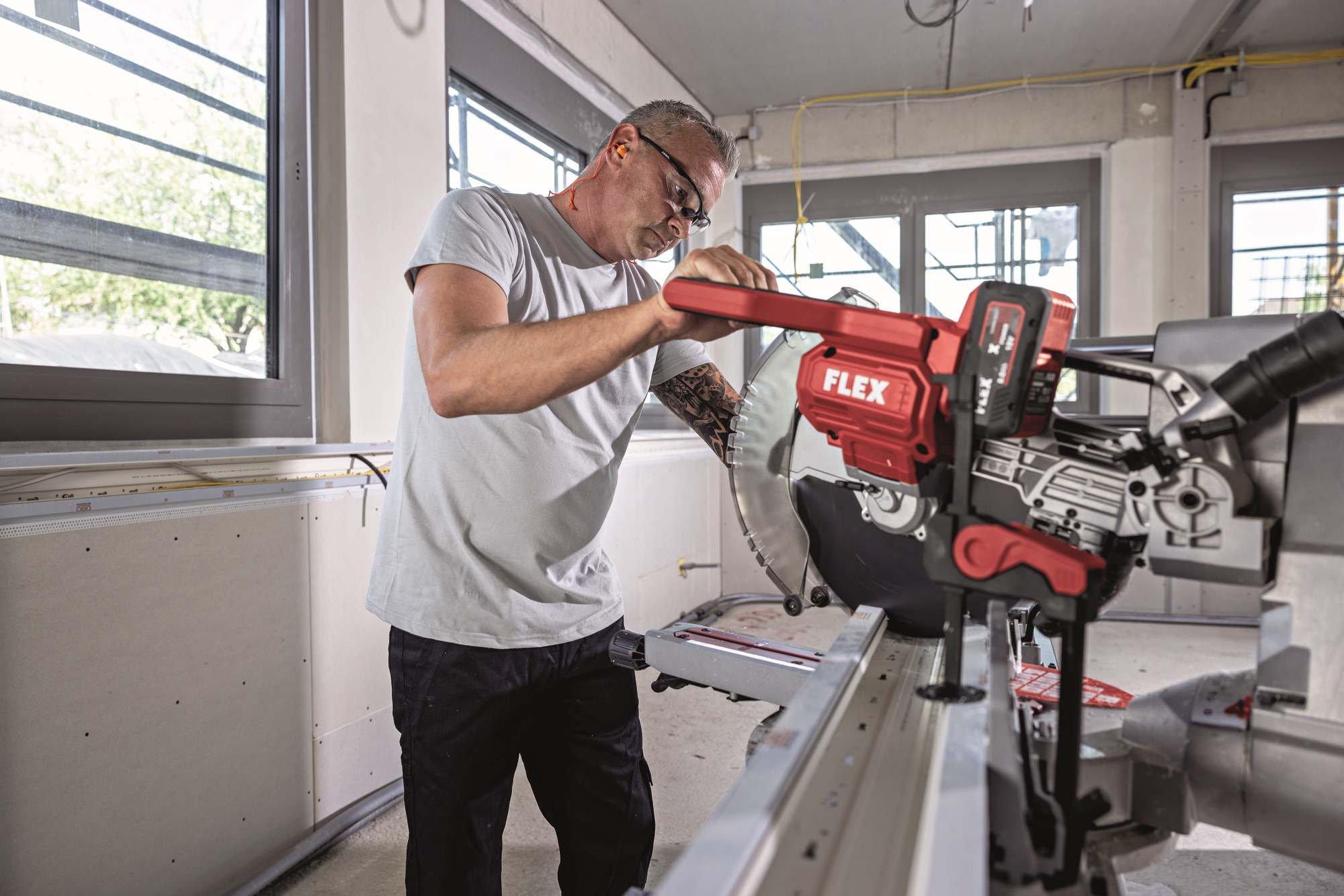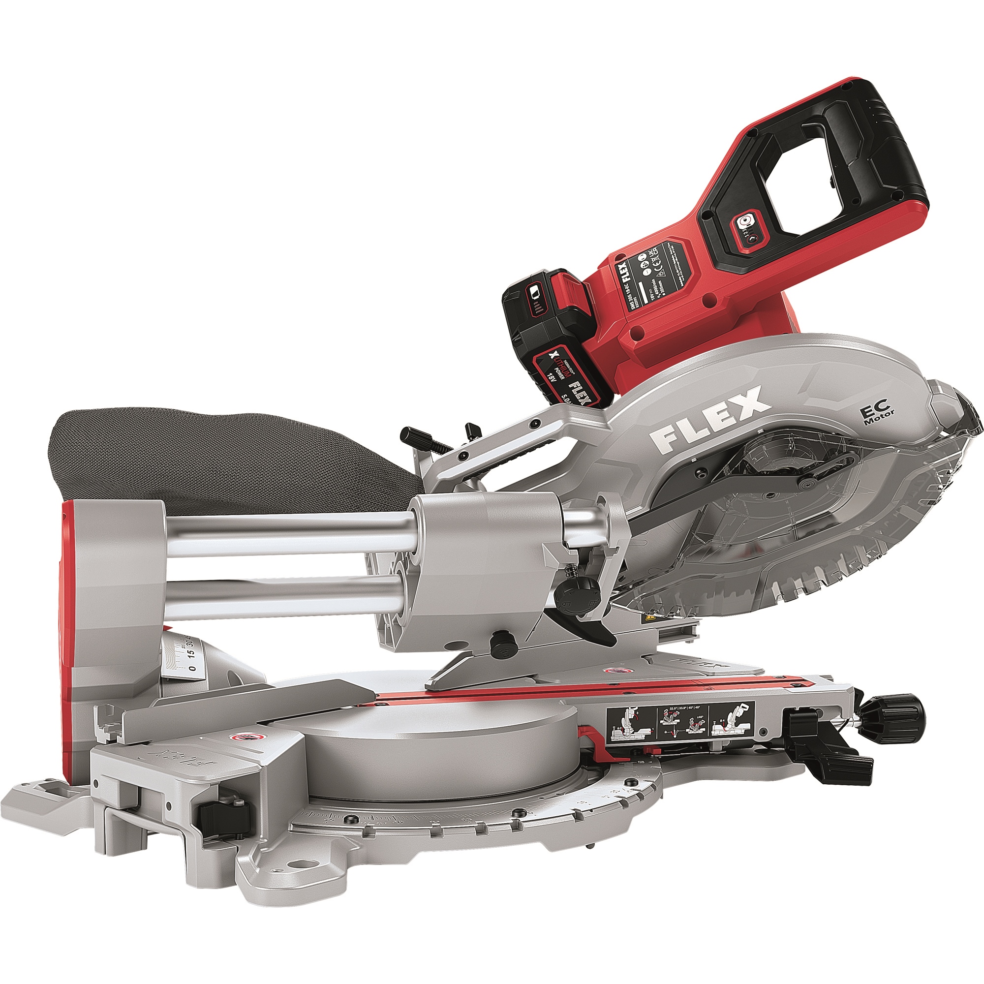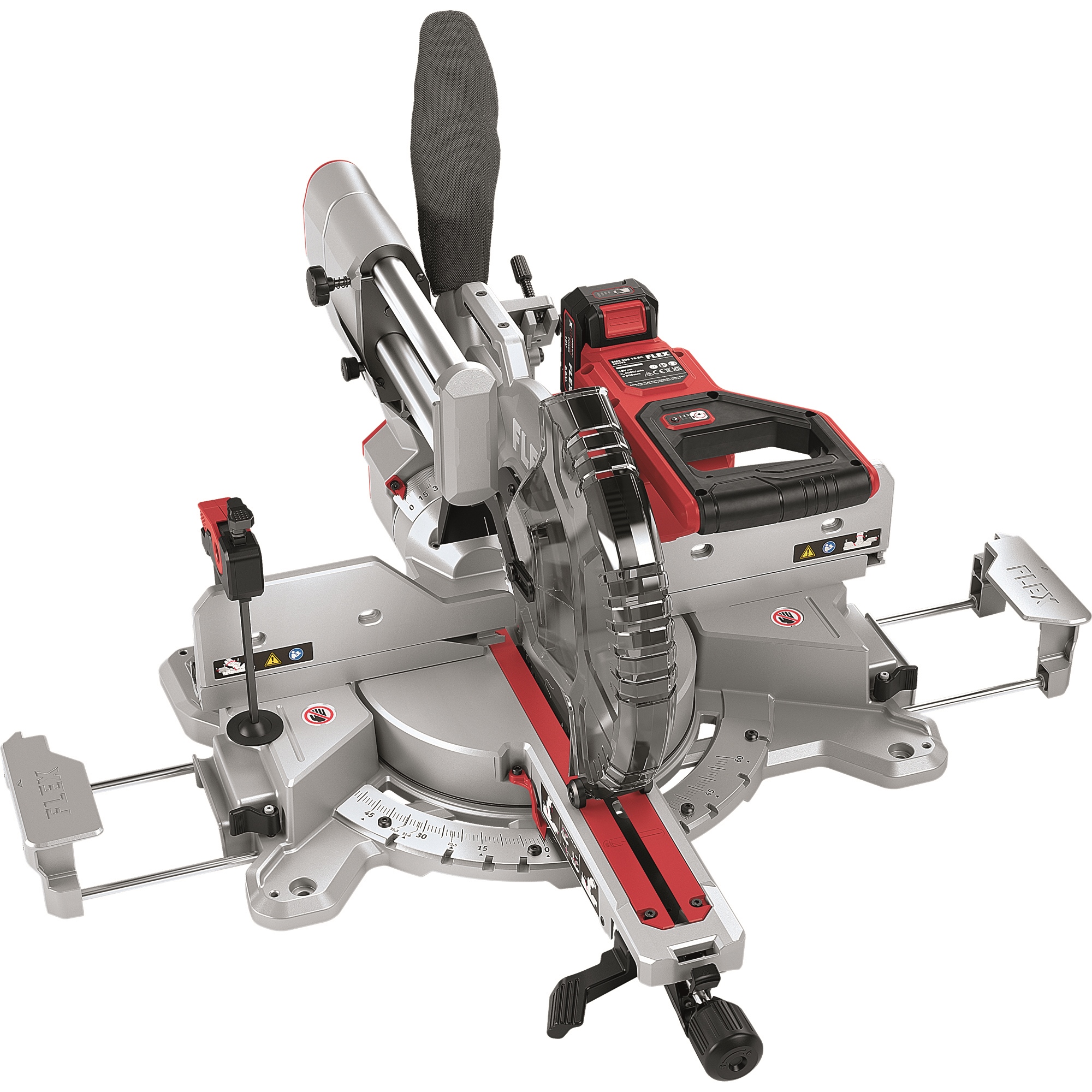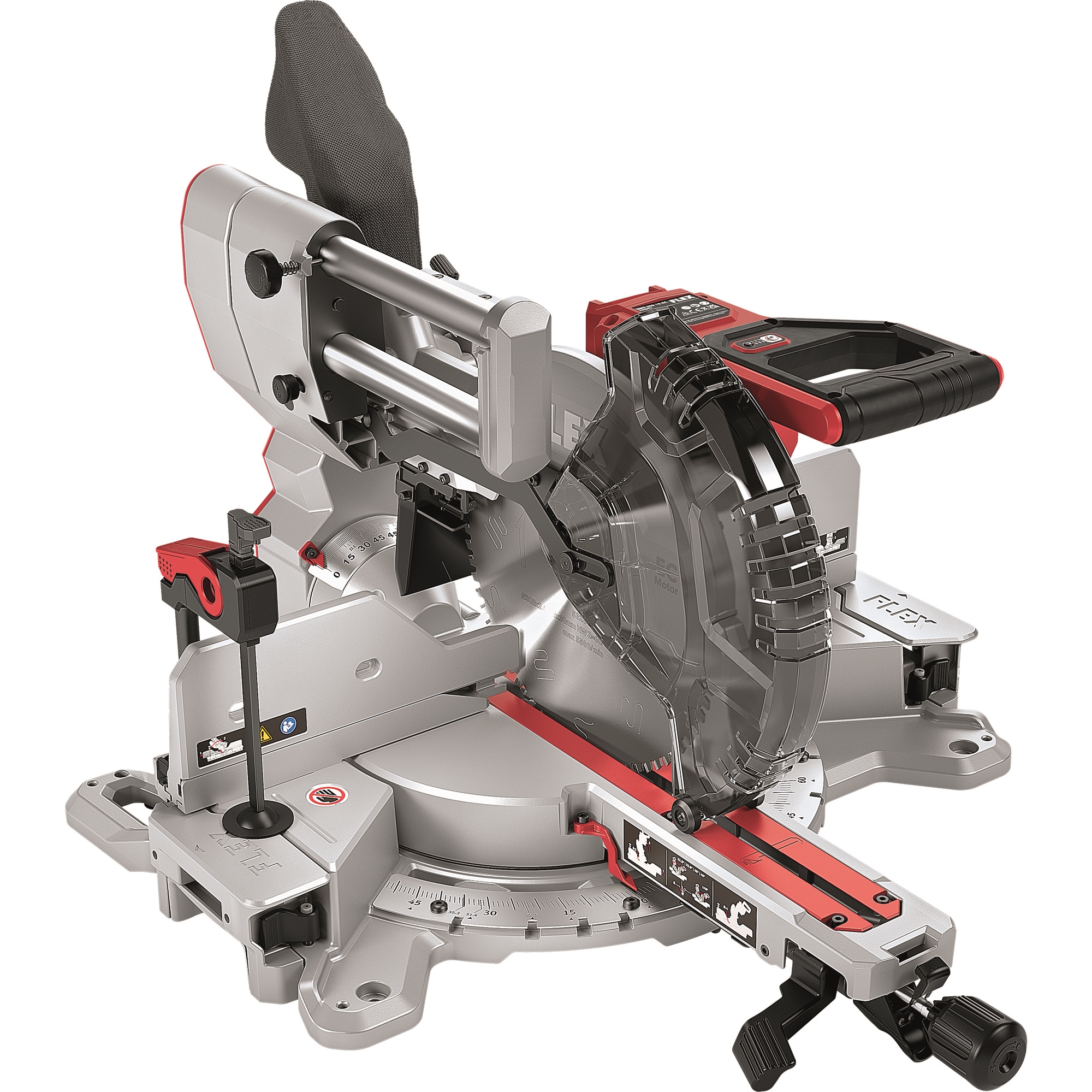 Kraftvolle und präzise Akku Kapp-Zugsäge mit großer Schnittkapazität: 101 x 330 mm und 92 x 356 mm. Die beidseitigen Tischverlängerungen unterstützen das Handling längerer Werkstücke