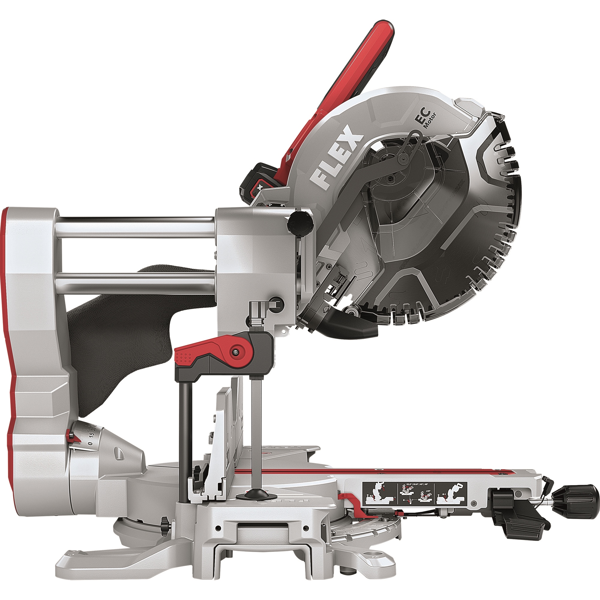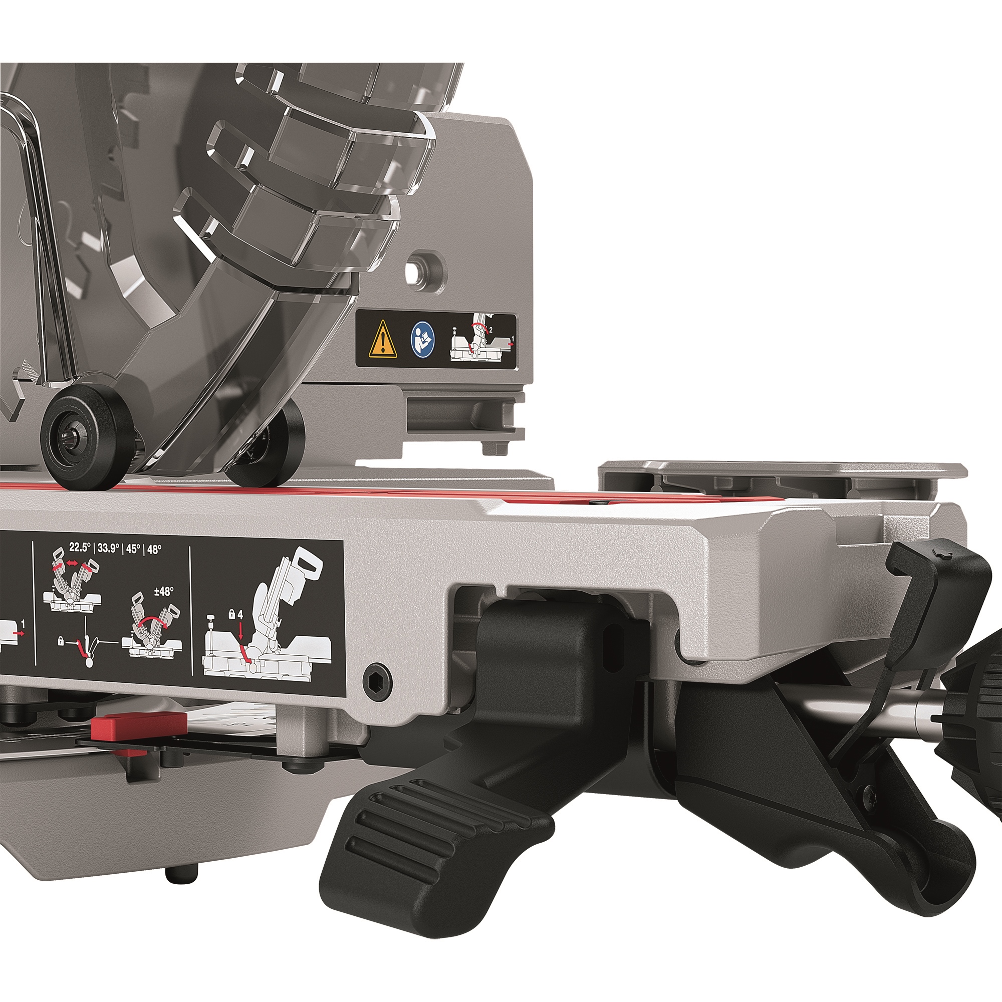 Gelaserte Winkelskala von 52° L / 60° R. Mit Winkelrastpunkten von 0°, 15°, 22,5°, 31,6°, 45° L / 0°, 15°, 22,5°, 31,6°, 45°, 60° R. Leicht ablesbar und exakt einstellbar durch selbsterklärende Bedienelemente