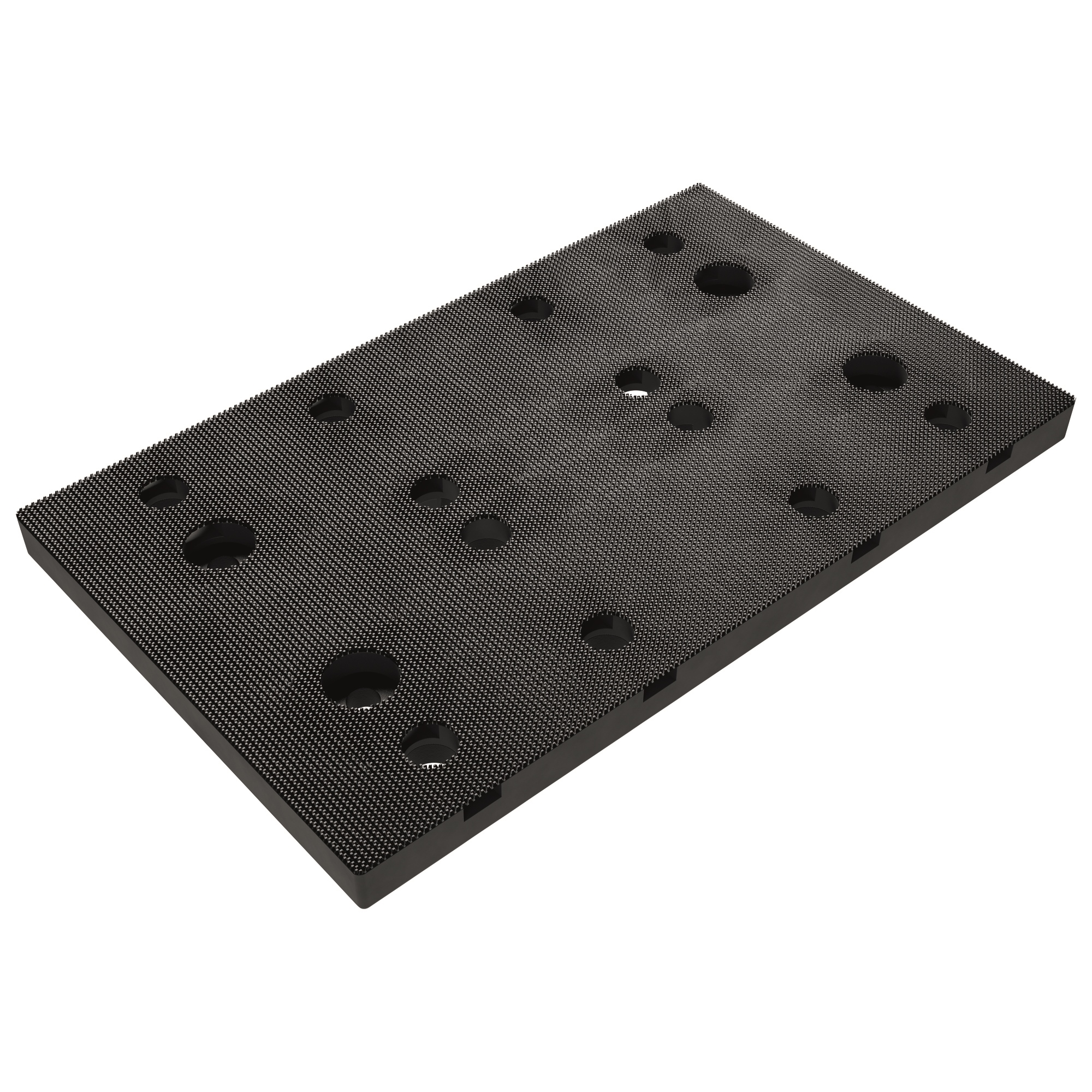 Schleifplatte mit Kantenschutz aus hoch strapazierfähigem Spezialmaterial mit Absauglochung (12x). Passend für alle gängigen Schleifmittel. Zum Schleifen von schmalen und kleinen Flächen.
