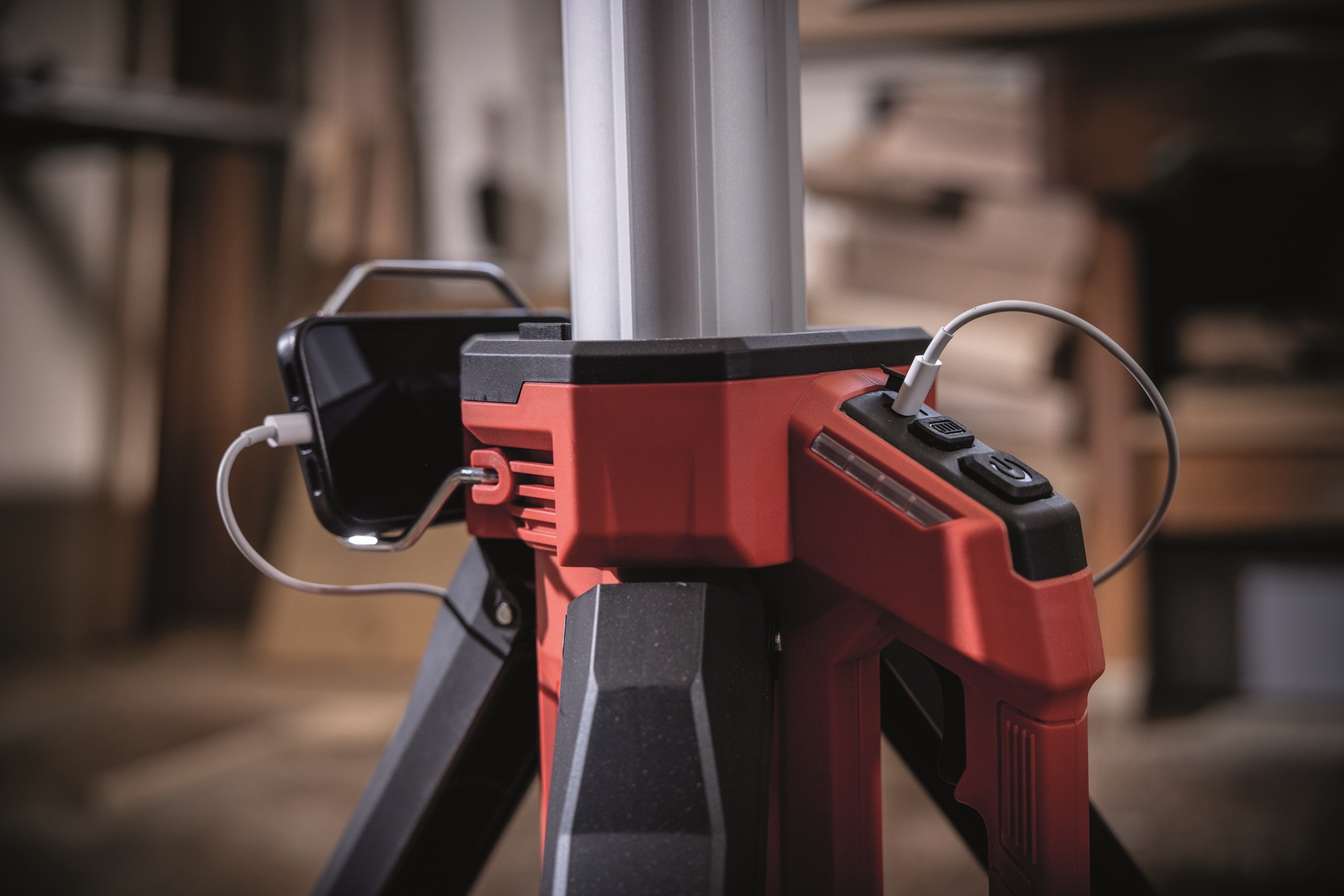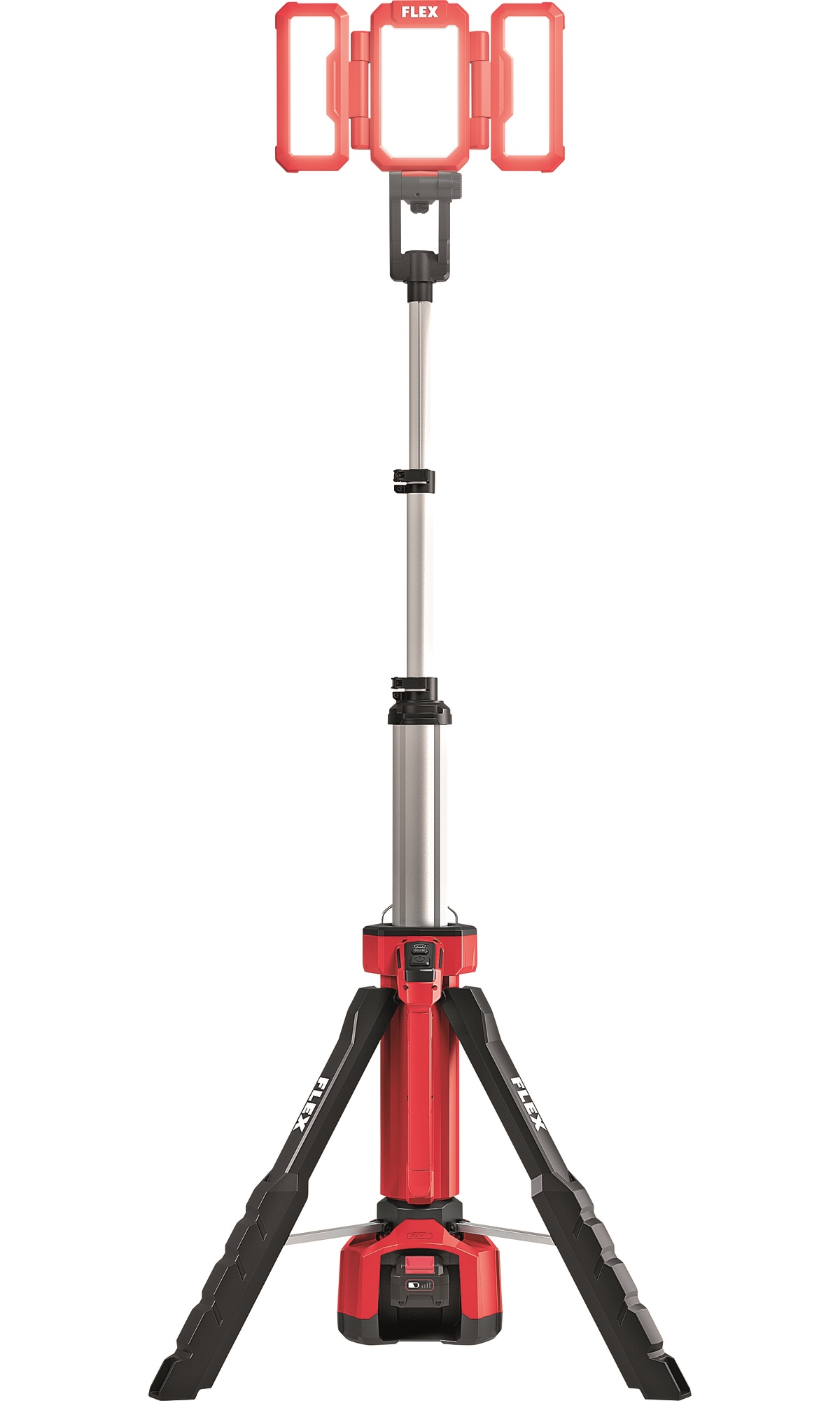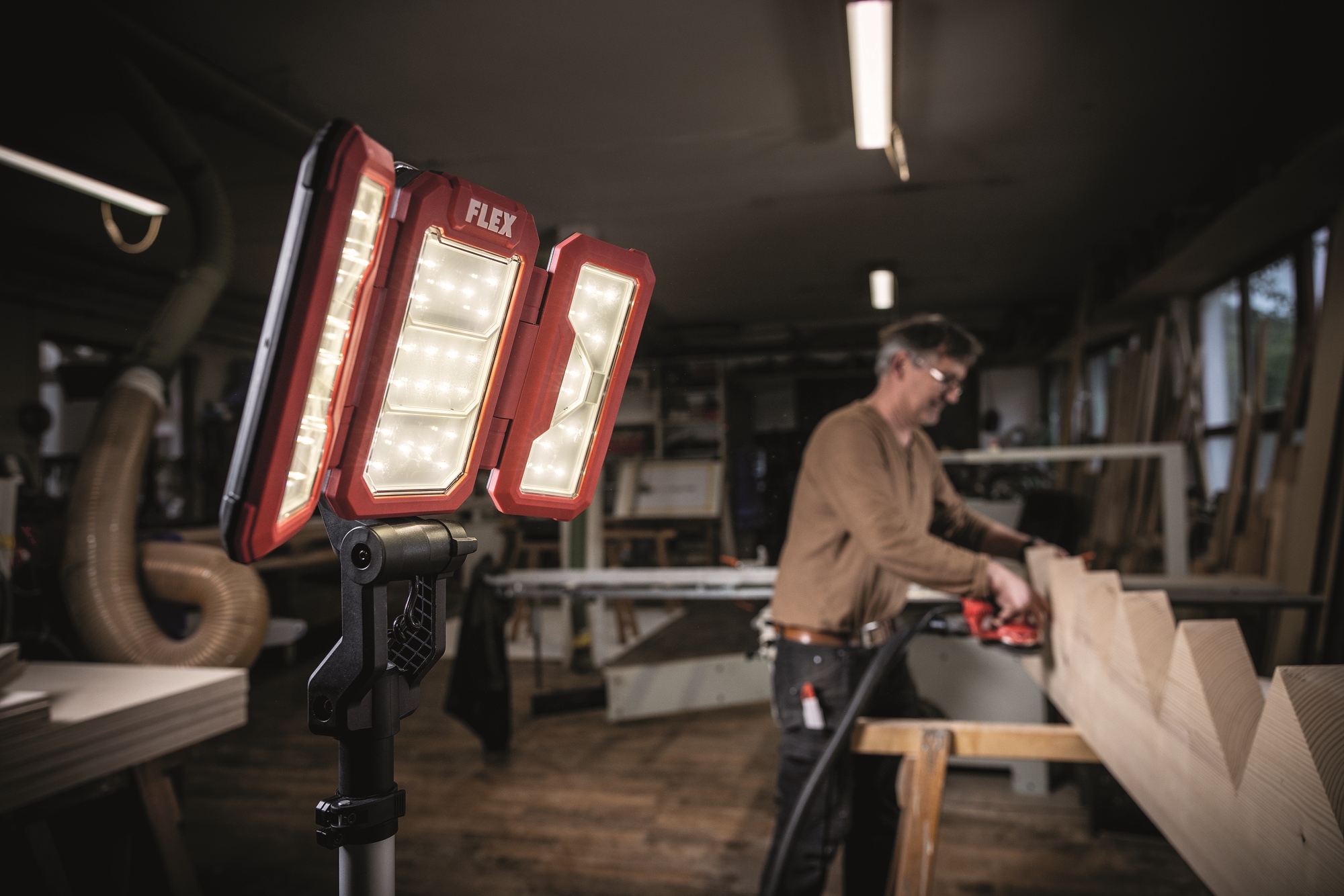 Der Multifunktionskopf kann als reine Arbeitsleuchte direkt mit einer 18V Batterie betrieben werden. Verwendung möglich durch Befestigung mit Haken oder auf Stativ montiert