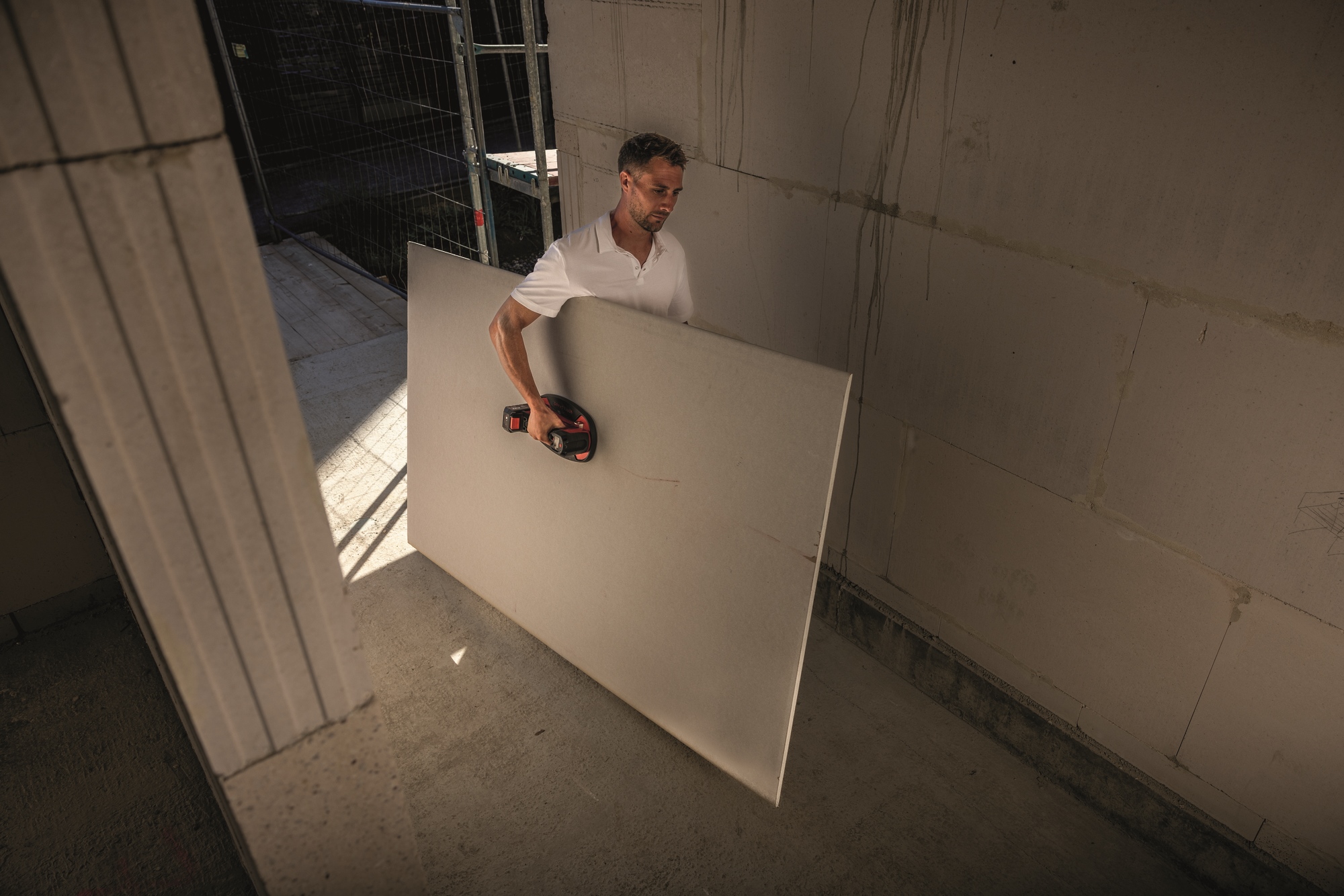 Der Vakuumheber verfügt über eine von den Umgebungsbedingungen abhängige Haltekraft von bis zu 170 kg und saugt sich auf fast jeder Oberfläche an, sogar an staubigen, rauen oder halbporösen Materialien. Die zulässige Tragfähigkeit beträgt 130 kg