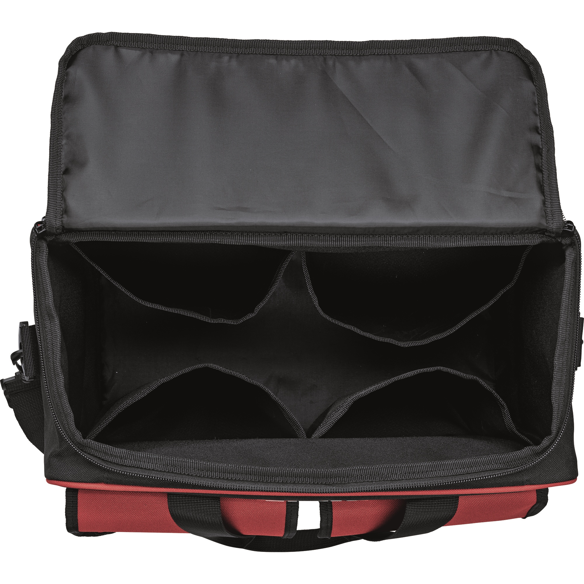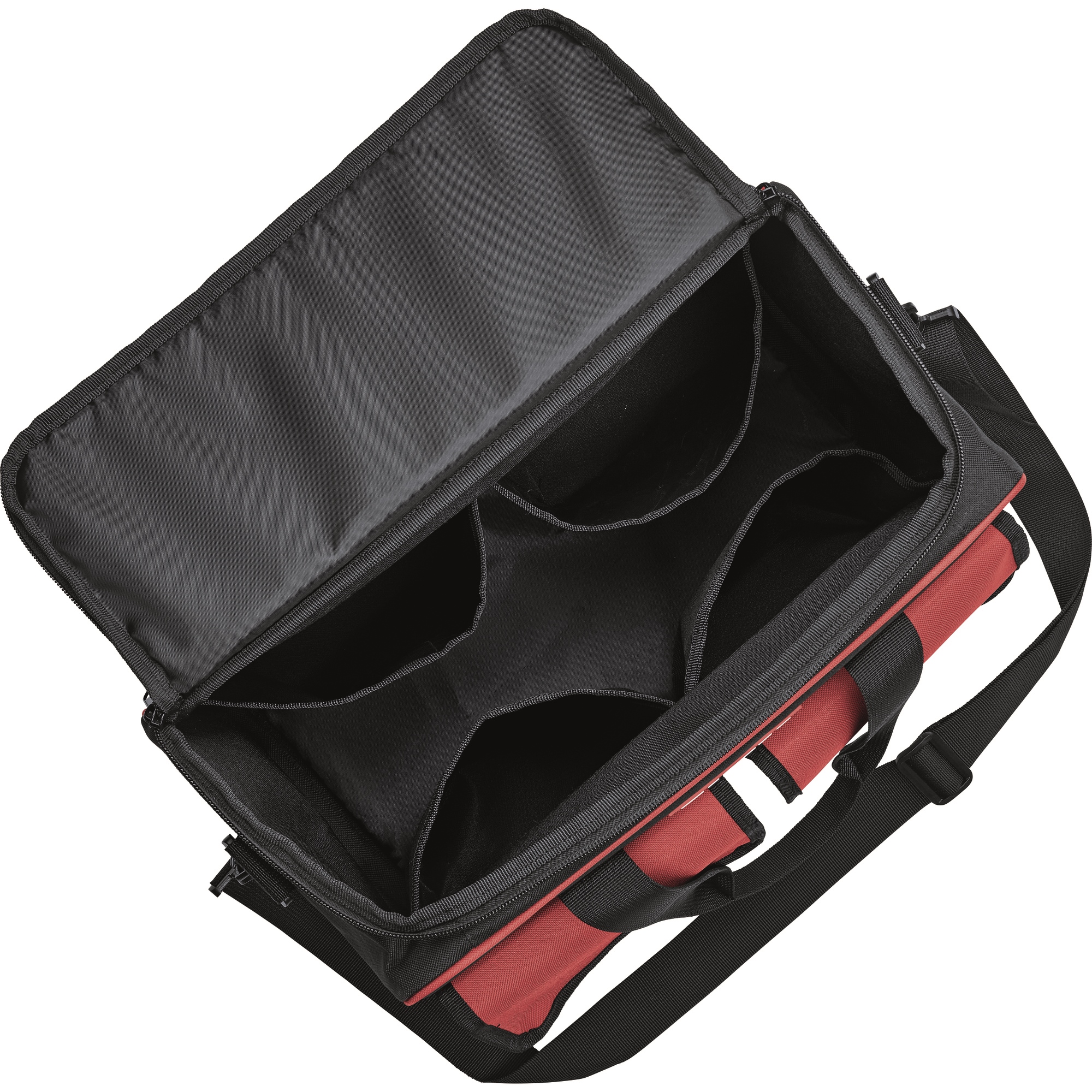 Sac de transport pratique en matière textile renforcée de plastique, résistante à la déchirure, avec large ouverture. Avec un grand espace de rangement à l'intérieur pouvant accueillir jusqu'à trois machines 12V, 2 poches extérieures à l'avant et des compartiments pour les accessoires tels que les batteries, le chargeur, etc.