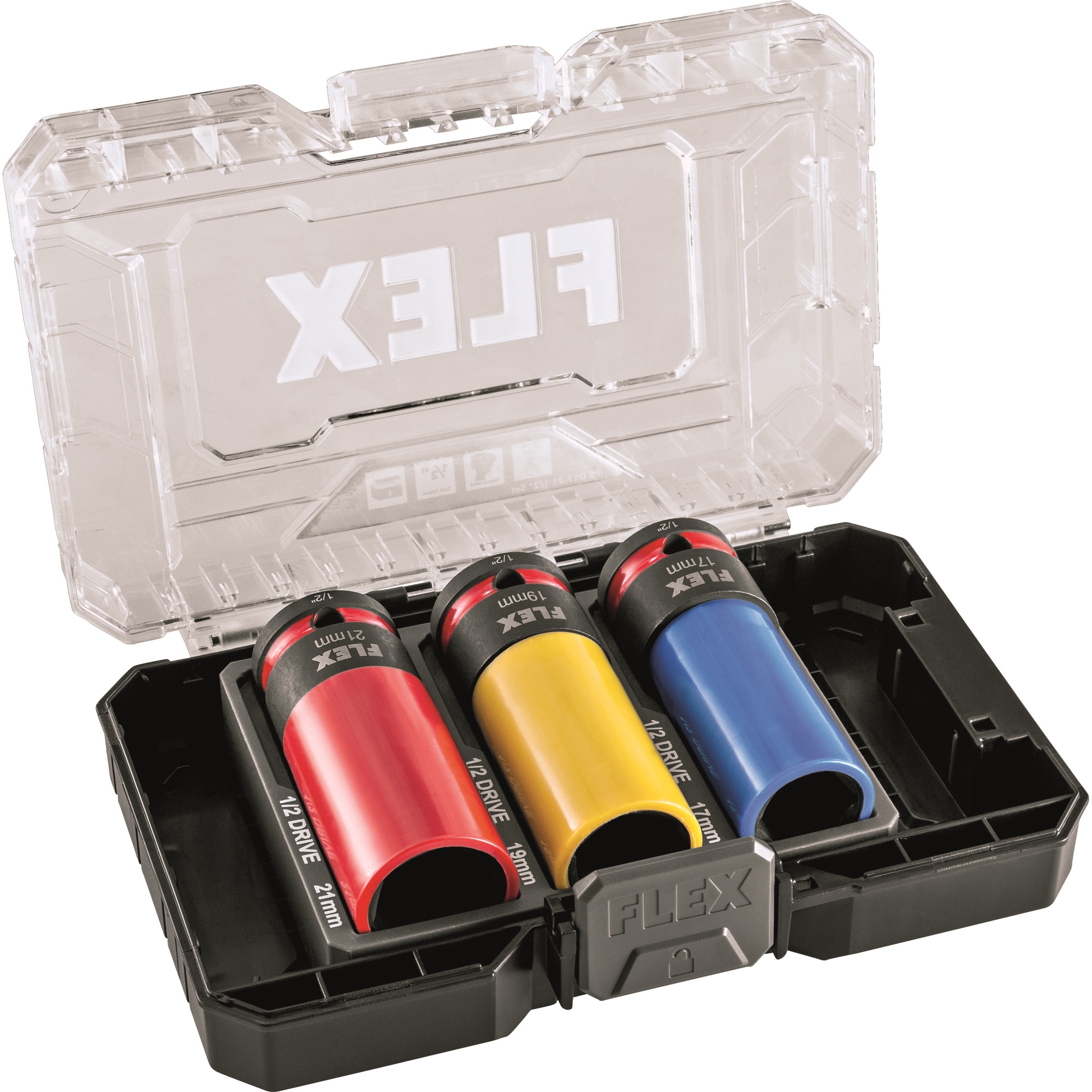 Jeu de douilles à choc sur mesure pour clés à chocs, spécialement adapté aux jantes en aluminium avec protection PET contre les rayures. Fabriqué en acier allié de haute qualité, très durable et résistant. Avec code couleur pour une identification facile des tailles. Boîte compatible avec le système STACK PACK, empilable. Taille 1/2 pouce.