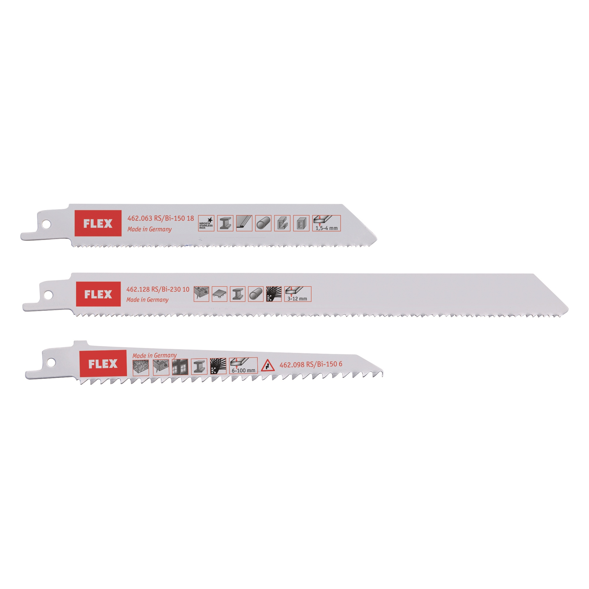 Assortiment comprenant : 1 lame de scie-sabre pour des coupes de 1,5 à 3 mm dans l’acier inoxydable, le métal/l’acier, les tôles d’acier, les tubes d’acier, les profilés ouverts/fermés. 1 lame de scie-sabre pour des coupes de 6 à 100 mm dans le MDF, le bois clouté, pour la rénovation de bâtiments anciens/les châssis de fenêtre, le métal/l’acier, les plastiques renforcés par des fibres/l’époxy, les coupes curvilignes. 1 lame de scie-sabre pour des coupes de 3 à 190 mm dans le bois clouté, le bois de palette, les plastiques renforcés par des fibres/l’époxy, ainsi que pour des coupes de 3 à 12 mm dans le métal/l’acier, les tubes d’acier.
