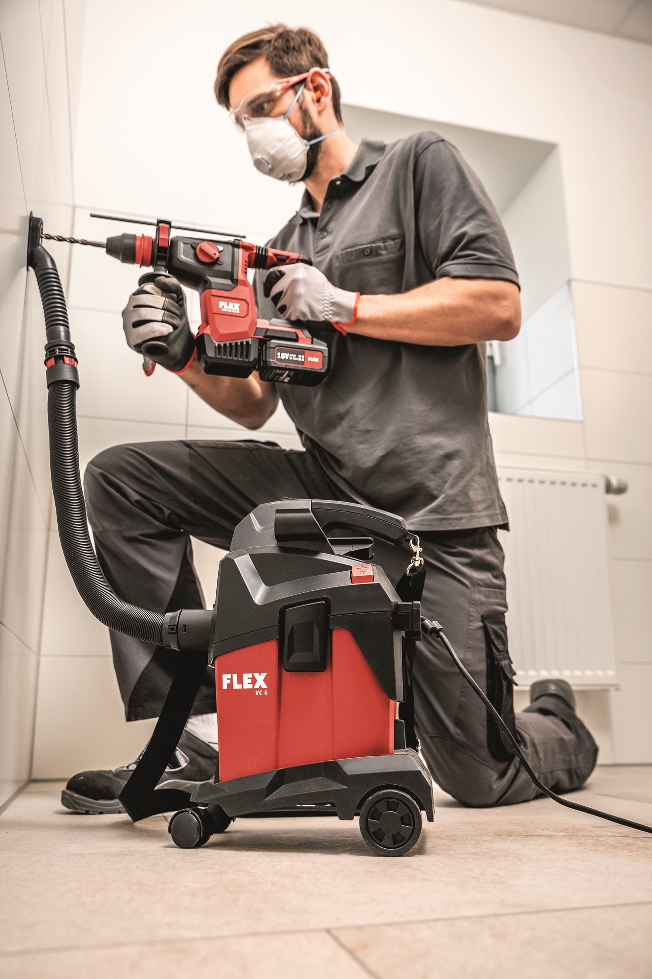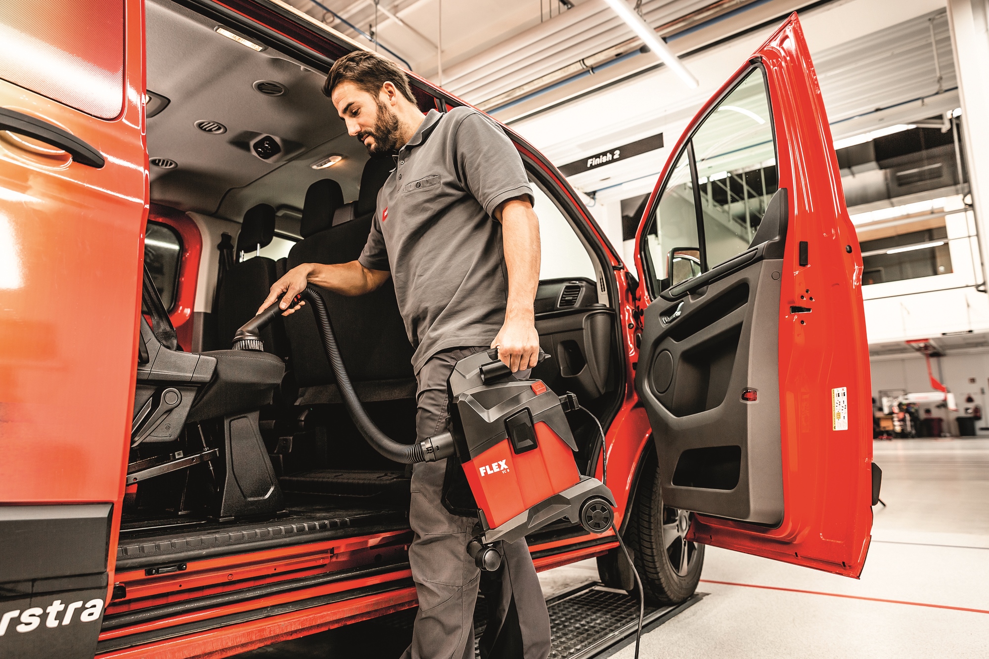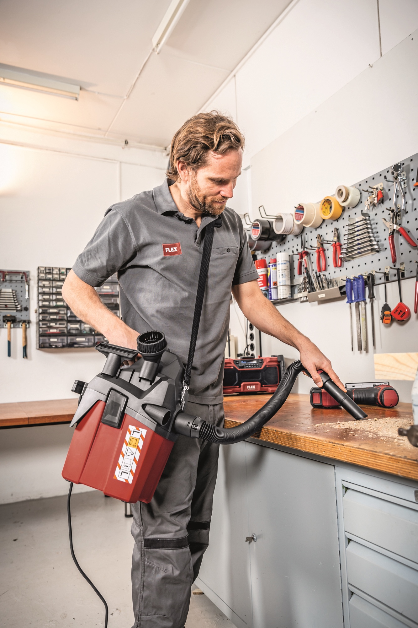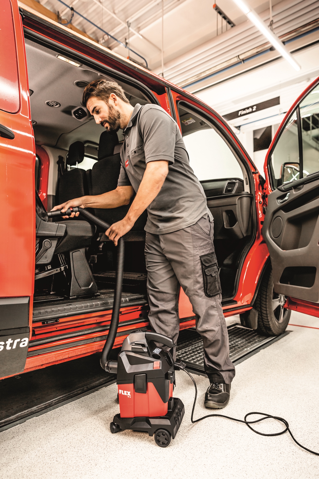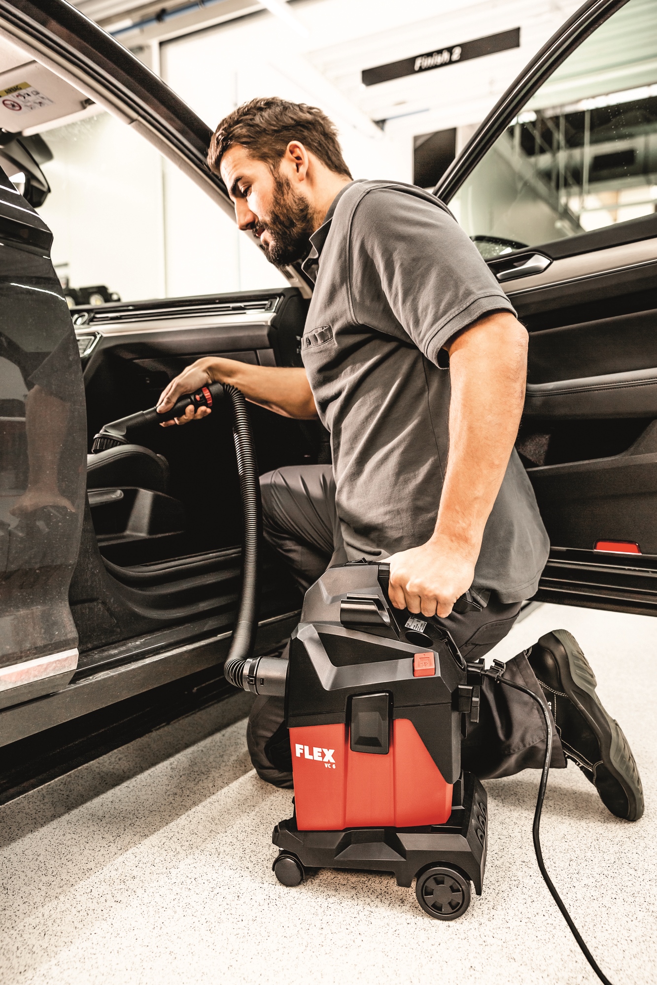 Aspirateur puissant pour une utilisation professionnelle lors du montage final, du nettoyage de véhicules, etc. Raccordement simple des outils électriques FLEX avec le système de clipsage FLEX pour les travaux d’aspiration