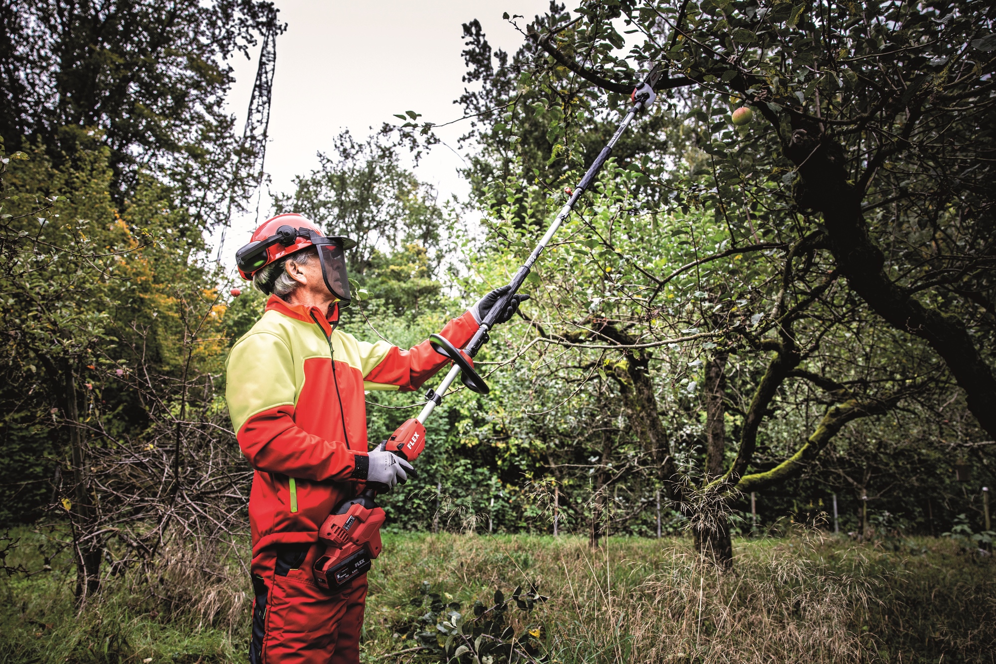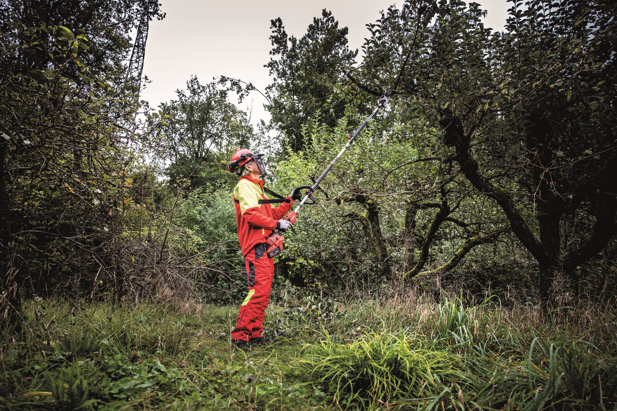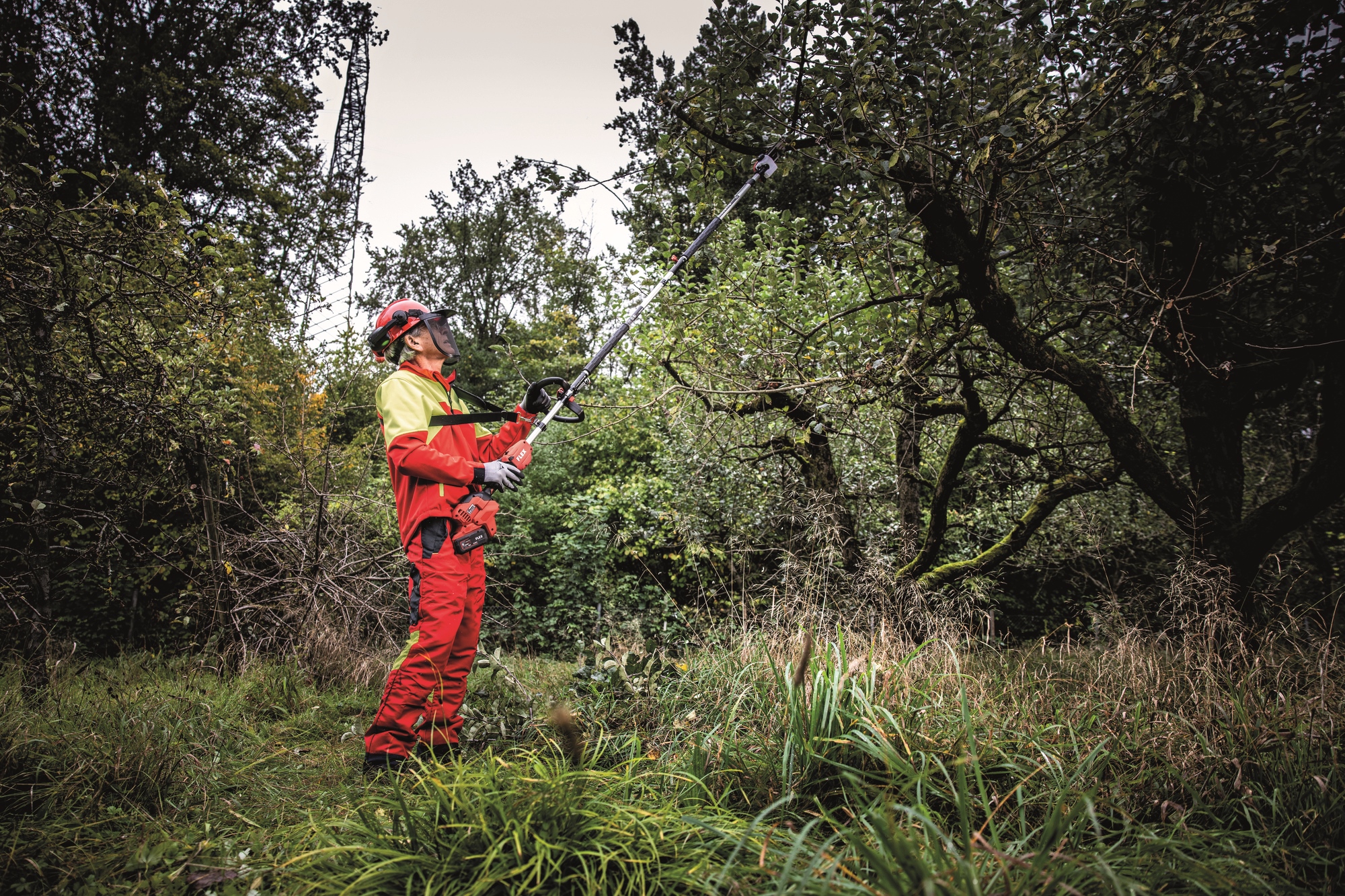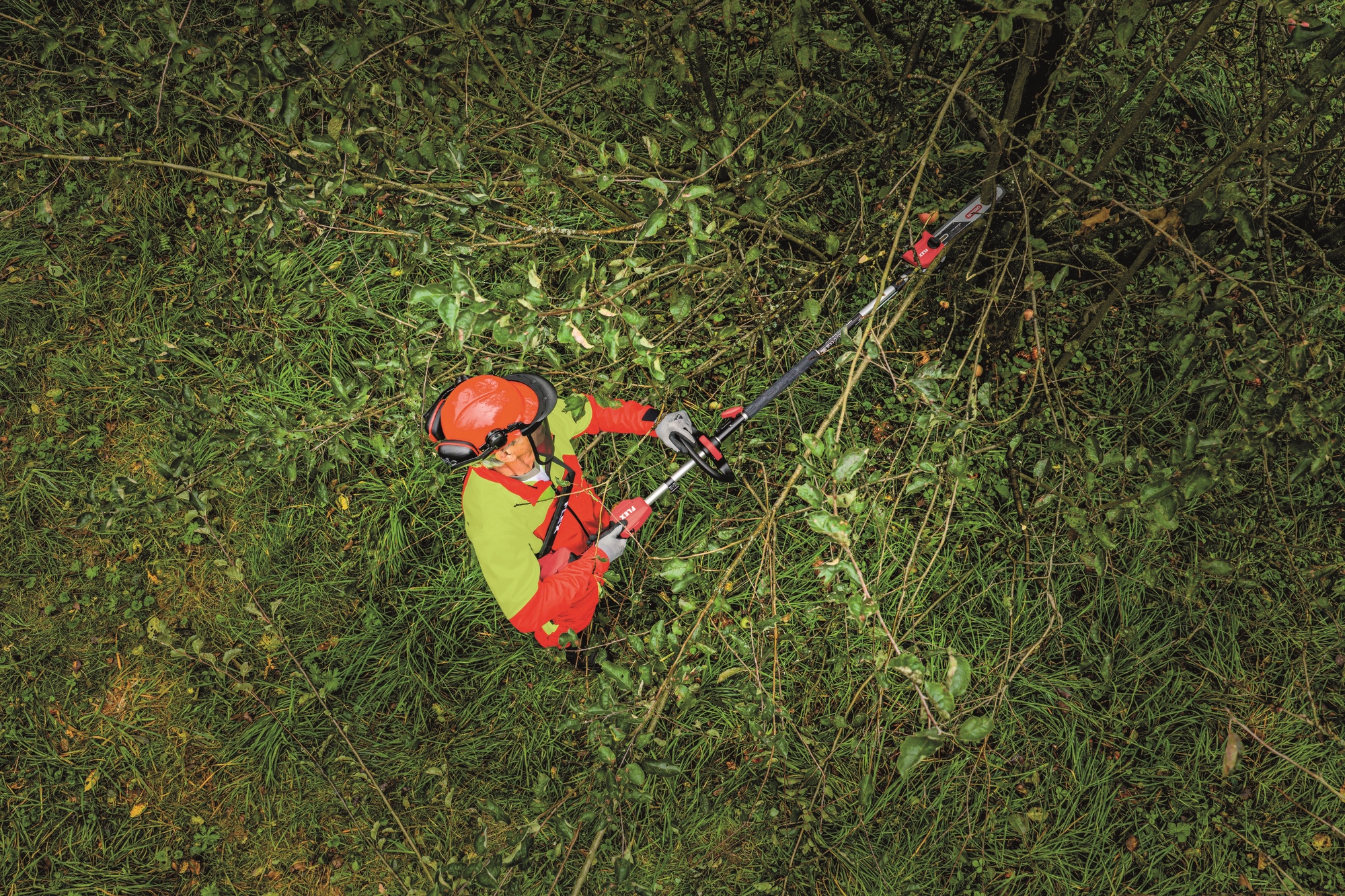 Il potatore ad asta, compresa la prolunga da 80 cm per l'unità di base a batteria o il tagliaerba a batteria, consente di tagliare rami alti senza bisogno di una scala. Attacco senza attrezzi