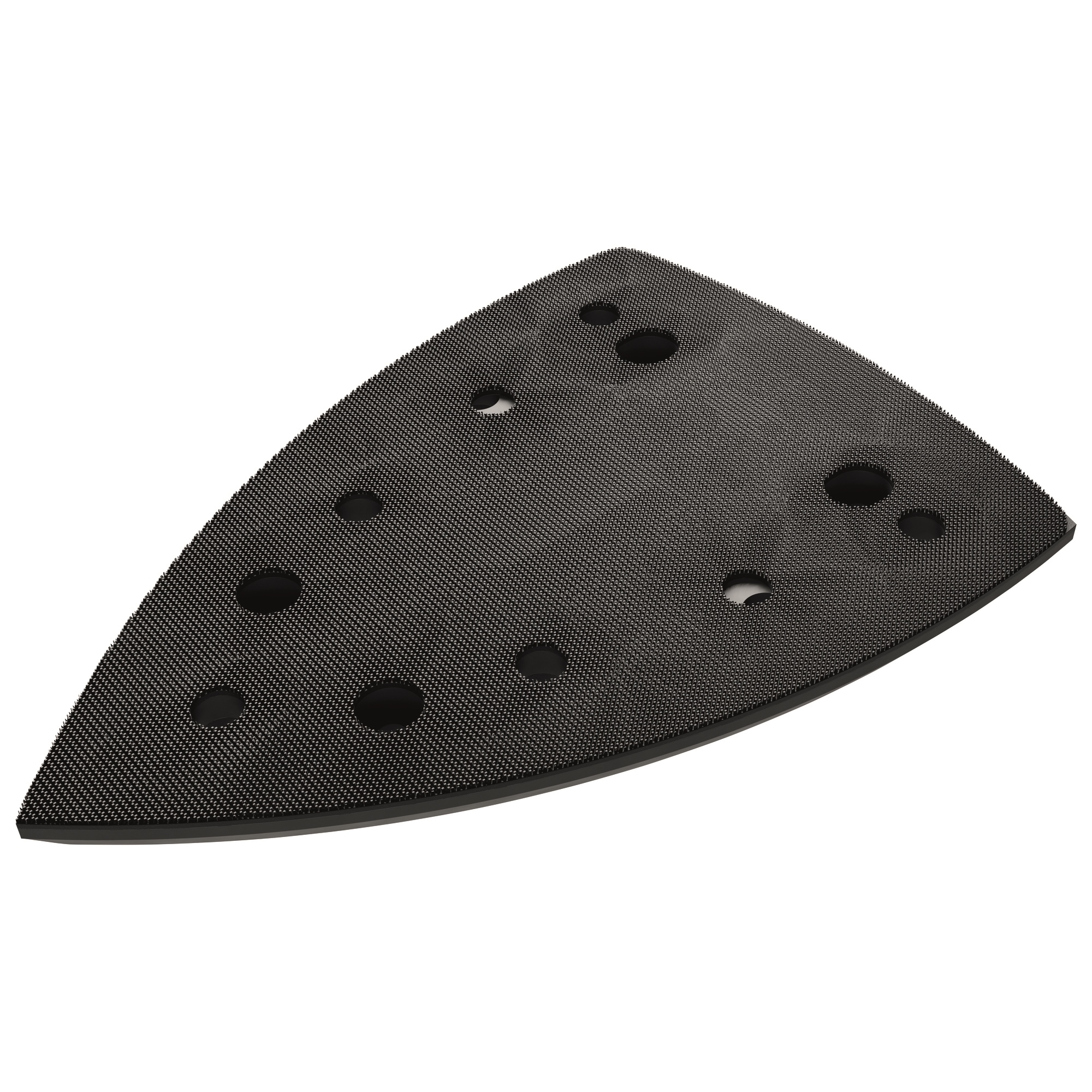 Piastra per levigatrice palmare in speciale materiale altamente resistente con 10 fori di aspirazione e bordi smussati per proteggere i pezzi in lavorazione. Compatibile con tutti gli abrasivi convenzionali. Per levigare bordi, angoli e superfici piccole e strette.