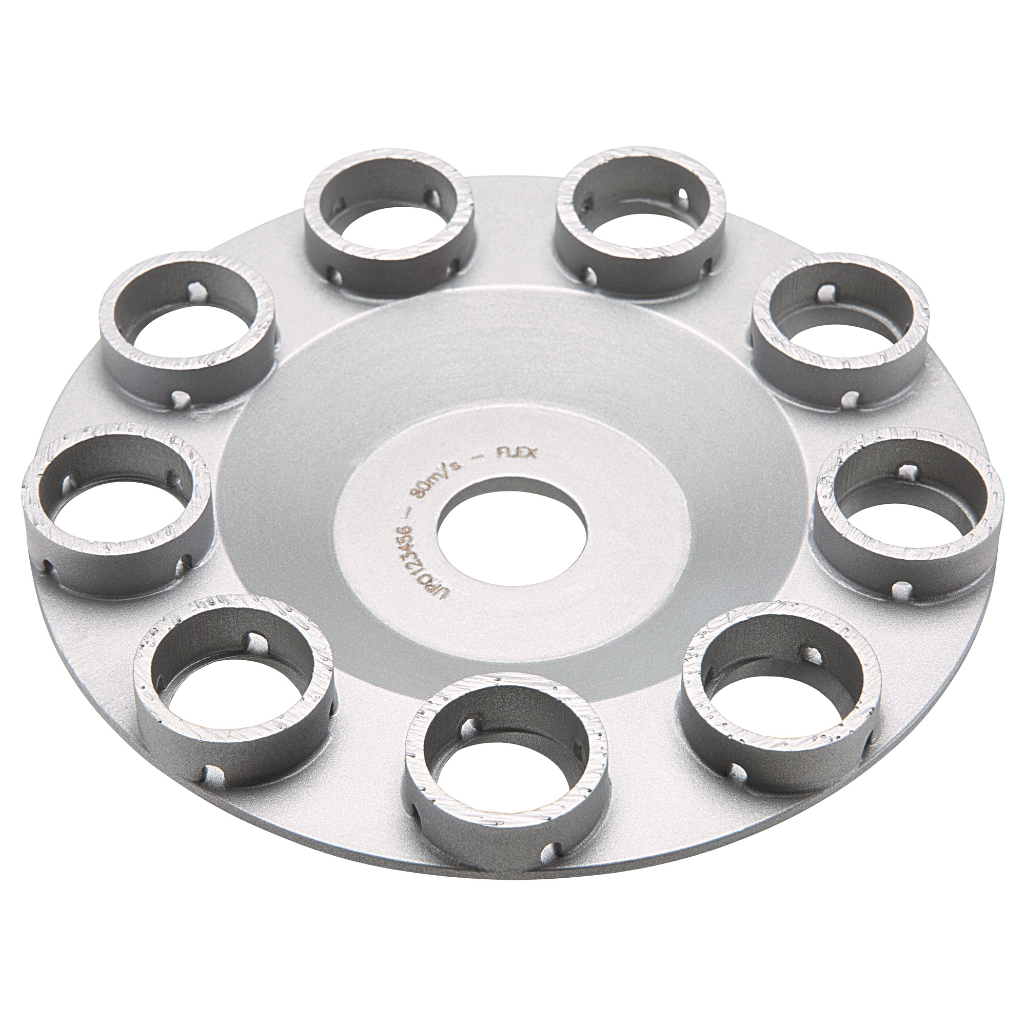 Platorello per la levigatura grossolana con un grado di asportazione elevato per levigare, ridurre / livellare irregolarità o sbavature su casseforme, strati sinterizzati, strati di vernice, residui di colla o termoplastici, graffiti, alghe e altro sporco. Con flangia sagomata FLEX.